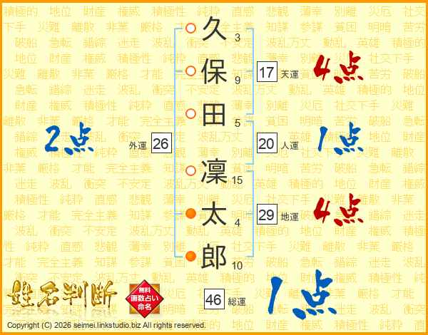 久(3画)保(9画)田(5画) 凜(15画)太(4画)郎(10画)