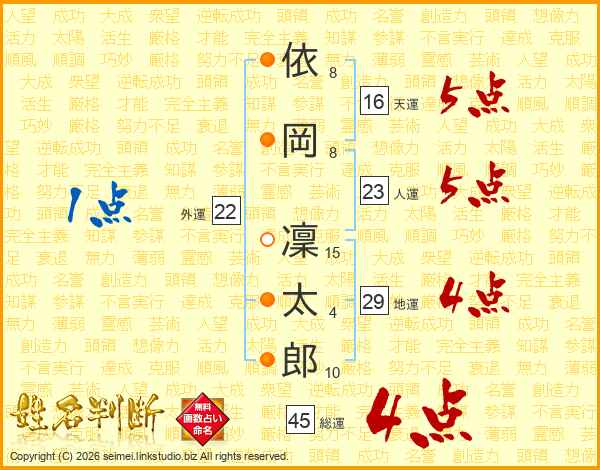 依(8画)岡(8画) 凜(15画)太(4画)郎(10画)