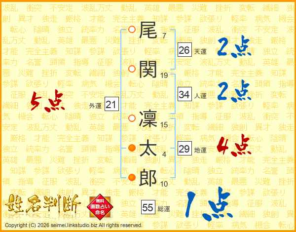 尾(7画)関(19画) 凜(15画)太(4画)郎(10画)