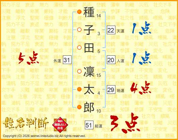 種(14画)子(3画)田(5画) 凜(15画)太(4画)郎(10画)