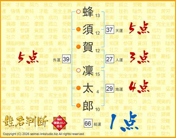 蜂(13画)須(12画)賀(12画) 凜(15画)太(4画)郎(10画)