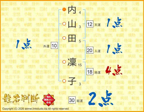 内(4画)山(3画)田(5画) 凜(15画)子(3画)