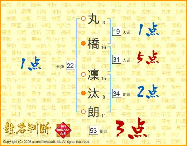 丸(3画)橋(16画) 凜(15画)汰(8画)朗(11画)