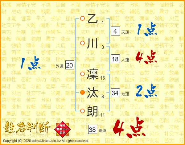乙(1画)川(3画) 凜(15画)汰(8画)朗(11画)