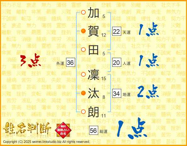 加(5画)賀(12画)田(5画) 凜(15画)汰(8画)朗(11画)