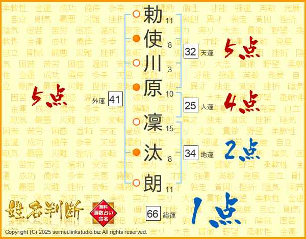 勅(11画)使(8画)川(3画)原(10画) 凜(15画)汰(8画)朗(11画)