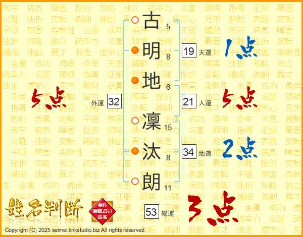 古(5画)明(8画)地(6画) 凜(15画)汰(8画)朗(11画)