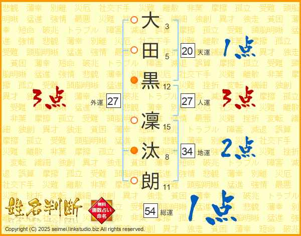 大(3画)田(5画)黒(12画) 凜(15画)汰(8画)朗(11画)