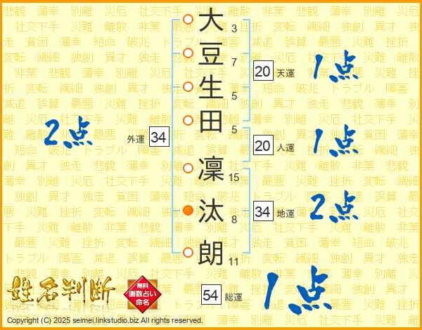 大(3画)豆(7画)生(5画)田(5画) 凜(15画)汰(8画)朗(11画)