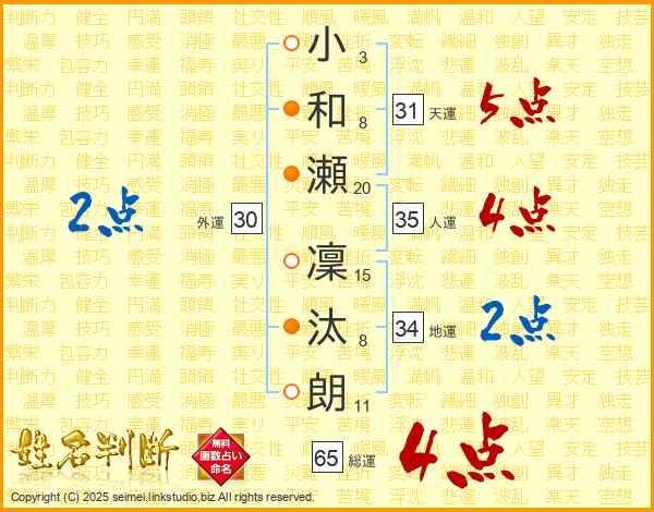 小(3画)和(8画)瀬(20画) 凜(15画)汰(8画)朗(11画)