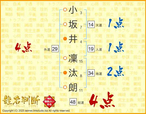 小(3画)坂(7画)井(4画) 凜(15画)汰(8画)朗(11画)