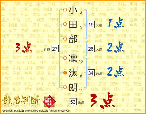 小(3画)田(5画)部(11画) 凜(15画)汰(8画)朗(11画)