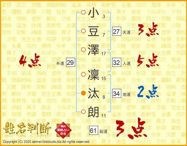 小(3画)豆(7画)澤(17画) 凜(15画)汰(8画)朗(11画)