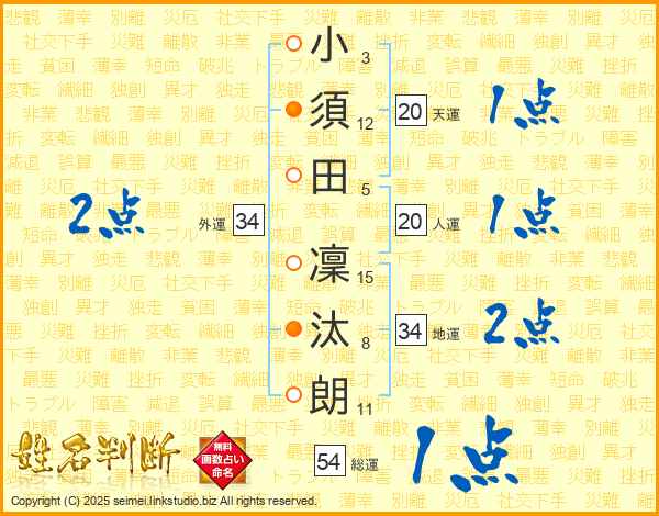 小(3画)須(12画)田(5画) 凜(15画)汰(8画)朗(11画)