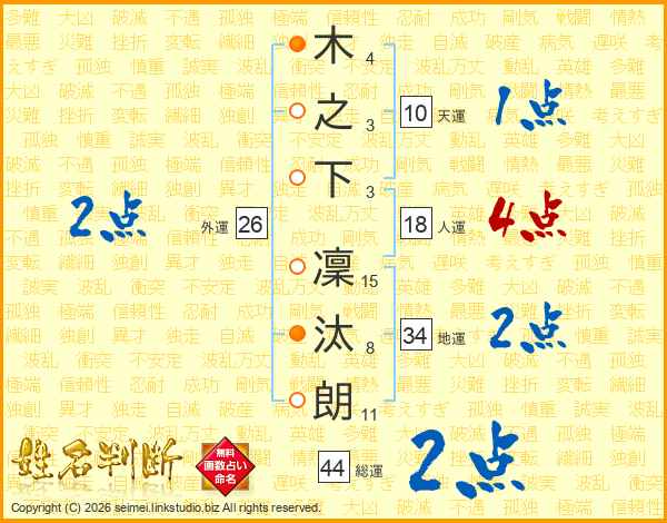 木(4画)之(3画)下(3画) 凜(15画)汰(8画)朗(11画)