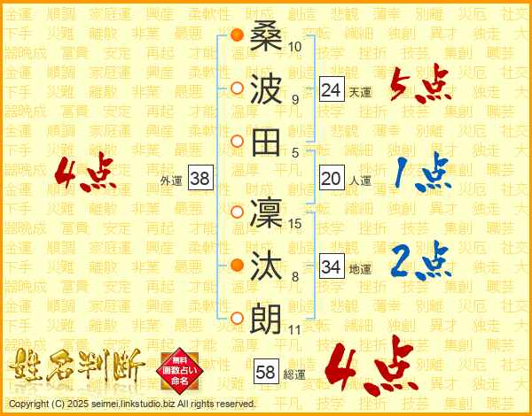 桑(10画)波(9画)田(5画) 凜(15画)汰(8画)朗(11画)