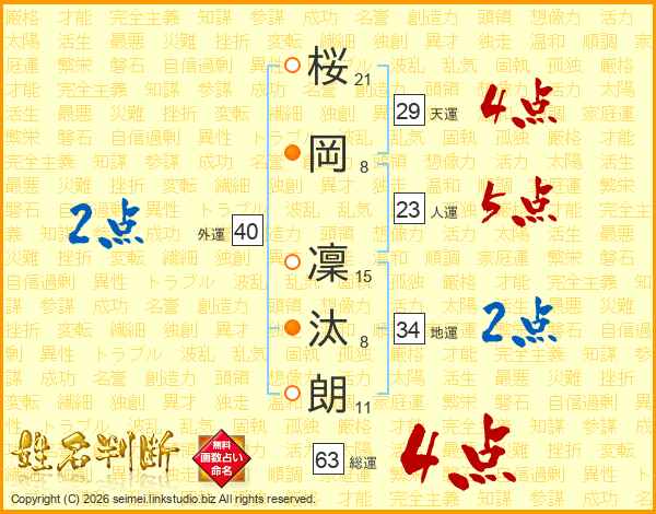 桜(21画)岡(8画) 凜(15画)汰(8画)朗(11画)