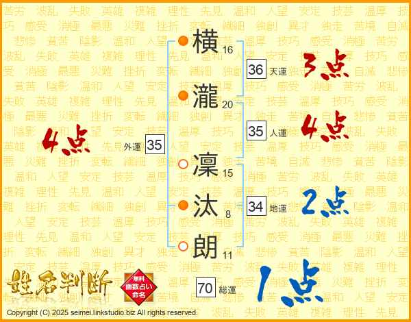 横(16画)瀧(20画) 凜(15画)汰(8画)朗(11画)
