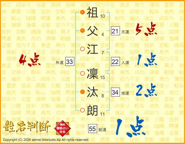 祖(10画)父(4画)江(7画) 凜(15画)汰(8画)朗(11画)