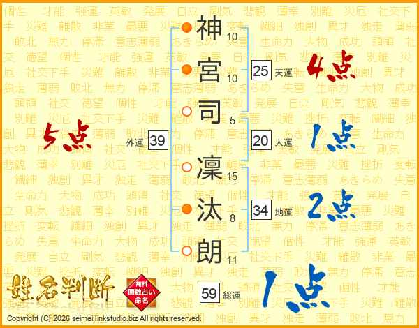 神(10画)宮(10画)司(5画) 凜(15画)汰(8画)朗(11画)