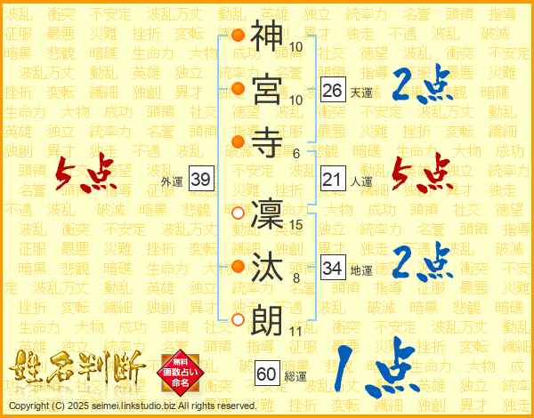 神(10画)宮(10画)寺(6画) 凜(15画)汰(8画)朗(11画)