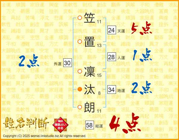 笠(11画)置(13画) 凜(15画)汰(8画)朗(11画)
