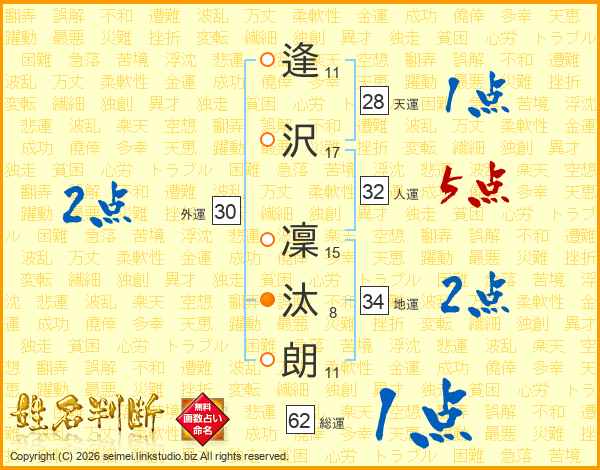 逢(11画)沢(17画) 凜(15画)汰(8画)朗(11画)