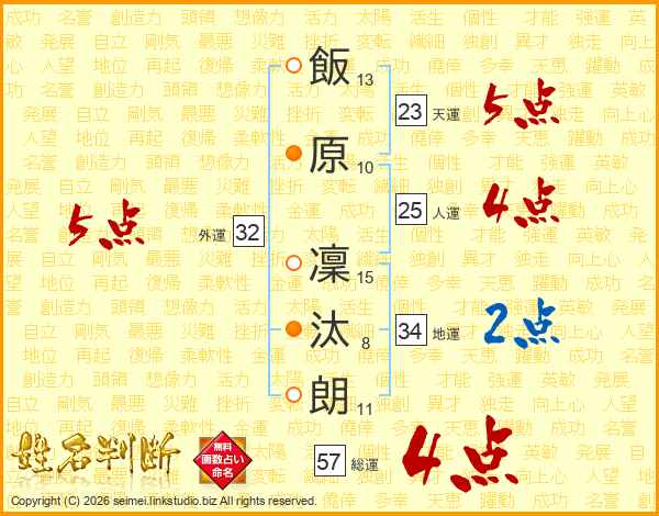 飯(13画)原(10画) 凜(15画)汰(8画)朗(11画)