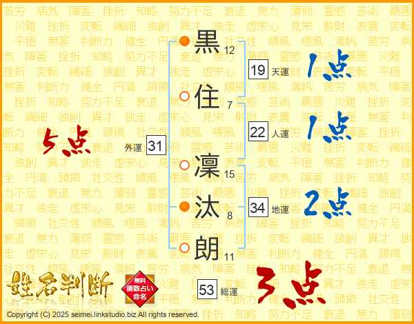黒(12画)住(7画) 凜(15画)汰(8画)朗(11画)