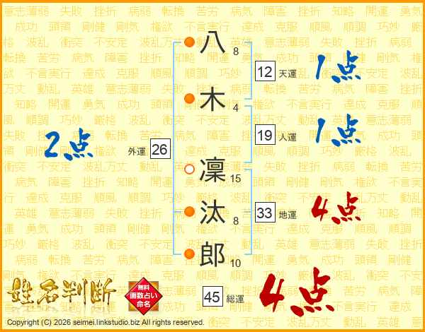 八(8画)木(4画) 凜(15画)汰(8画)郎(10画)