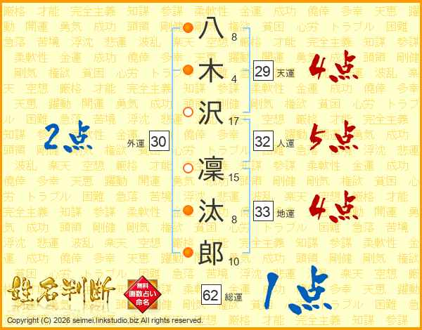 八(8画)木(4画)沢(17画) 凜(15画)汰(8画)郎(10画)