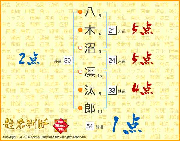 八(8画)木(4画)沼(9画) 凜(15画)汰(8画)郎(10画)