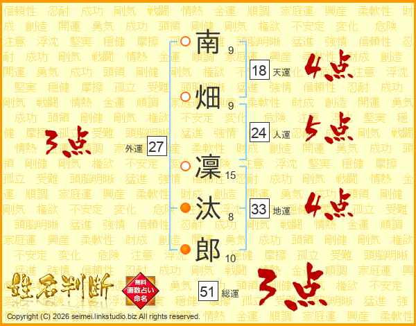 南(9画)畑(9画) 凜(15画)汰(8画)郎(10画)