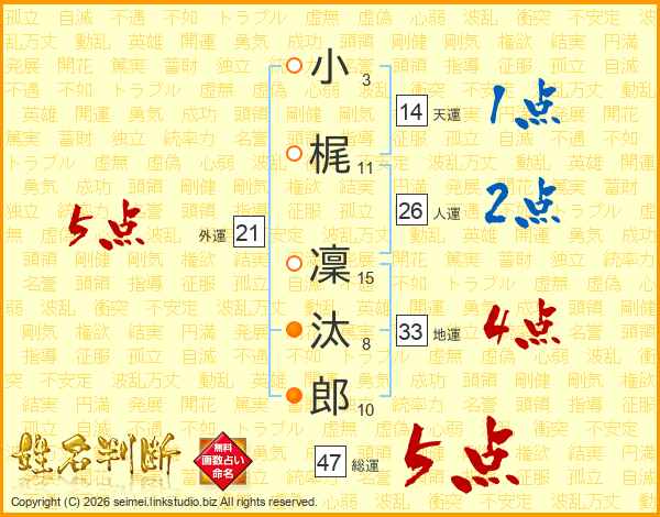 小(3画)梶(11画) 凜(15画)汰(8画)郎(10画)