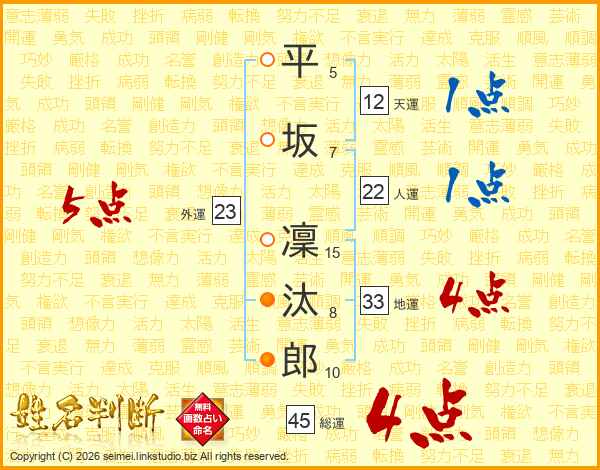 平(5画)坂(7画) 凜(15画)汰(8画)郎(10画)
