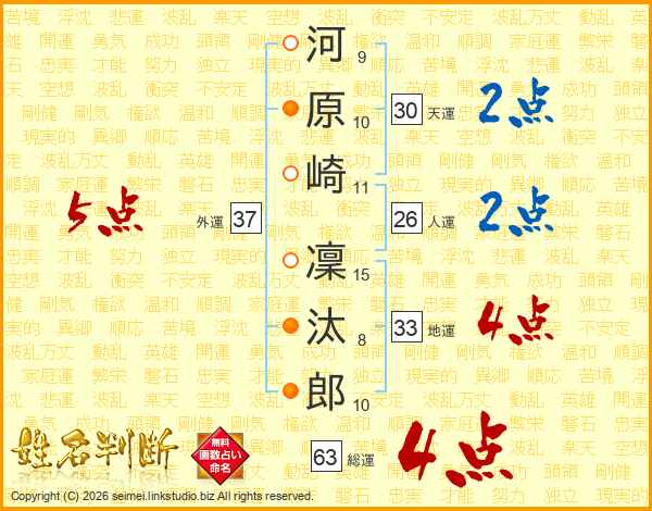 河(9画)原(10画)崎(11画) 凜(15画)汰(8画)郎(10画)
