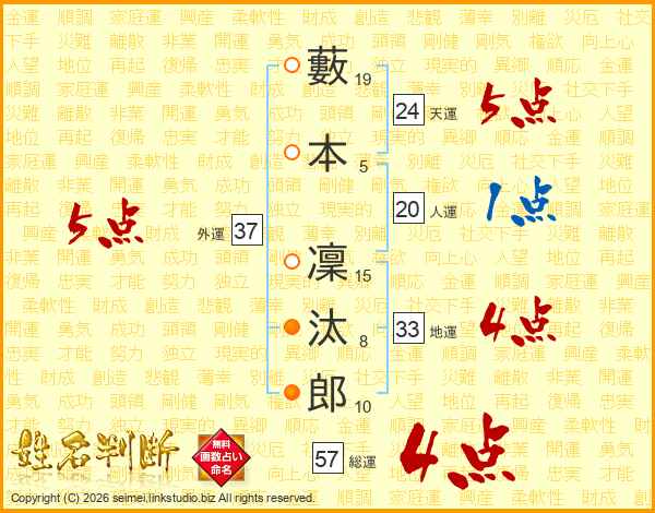 藪(19画)本(5画) 凜(15画)汰(8画)郎(10画)