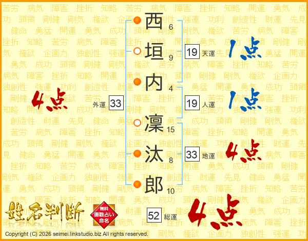 西(6画)垣(9画)内(4画) 凜(15画)汰(8画)郎(10画)