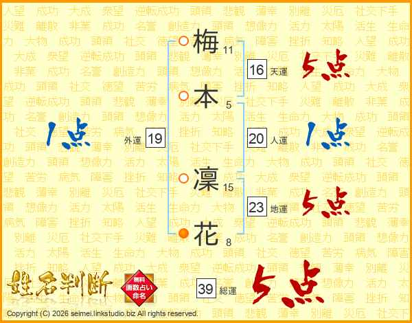 あなたの人生を表す1番重要な運勢です。生涯を通じて影響する総合運となり、主に50歳以降の晩年期に影響を及ぼします。苗字と名前の合計画数。