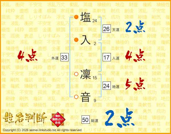 生活面を象徴する運勢です。外部から受ける影響力を表し、結婚運、家庭運や職場、環境への順応性を表します。総運から人運を引いた画数。姓や名が1文字の場合を除く。