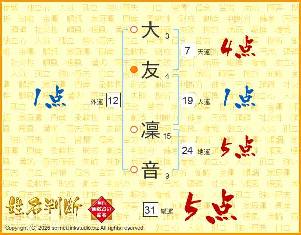生活面を象徴する運勢です。外部から受ける影響力を表し、結婚運、家庭運や職場、環境への順応性を表します。総運から人運を引いた画数。姓や名が1文字の場合を除く。