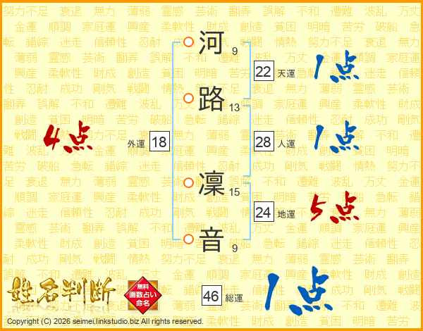 生活面を象徴する運勢です。外部から受ける影響力を表し、結婚運、家庭運や職場、環境への順応性を表します。総運から人運を引いた画数。姓や名が1文字の場合を除く。