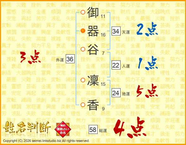 御(11画)器(16画)谷(7画) 凜(15画)香(9画)