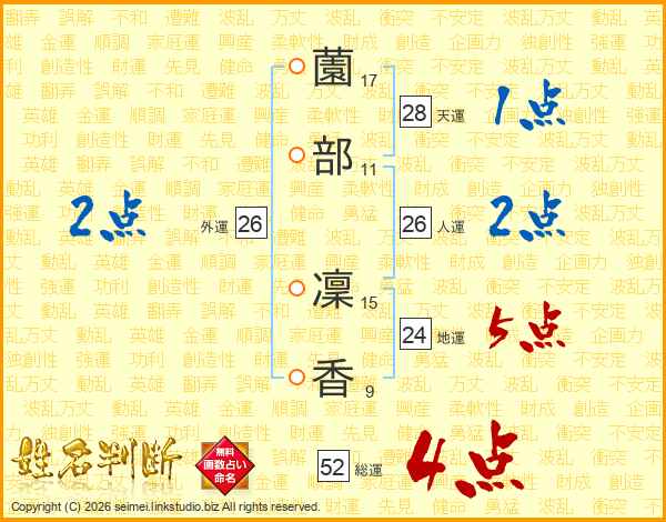 生活面を象徴する運勢です。外部から受ける影響力を表し、結婚運、家庭運や職場、環境への順応性を表します。総運から人運を引いた画数。姓や名が1文字の場合を除く。
