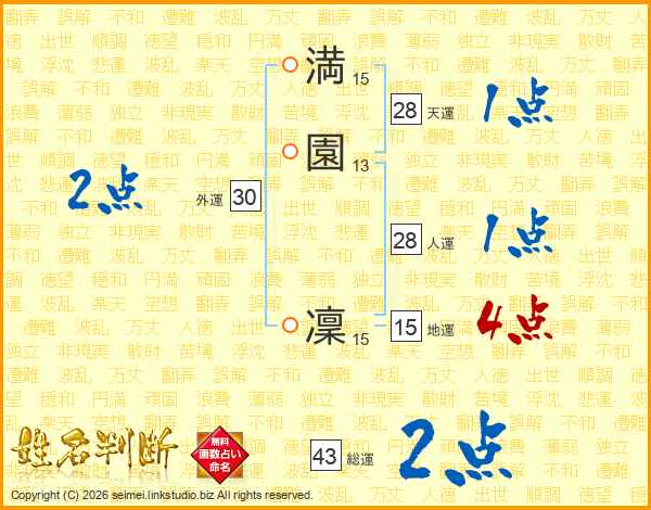 生活面を象徴する運勢です。外部から受ける影響力を表し、結婚運、家庭運や職場、環境への順応性を表します。総運から人運を引いた画数。姓や名が1文字の場合を除く。