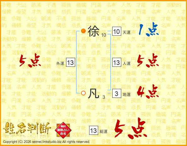 生活面を象徴する運勢です。外部から受ける影響力を表し、結婚運、家庭運や職場、環境への順応性を表します。総運から人運を引いた画数。姓や名が1文字の場合を除く。