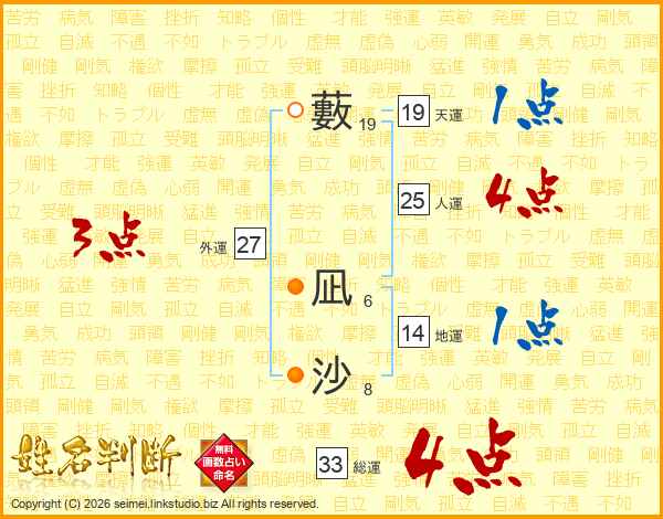 生活面を象徴する運勢です。外部から受ける影響力を表し、結婚運、家庭運や職場、環境への順応性を表します。総運から人運を引いた画数。姓や名が1文字の場合を除く。