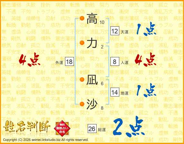 生活面を象徴する運勢です。外部から受ける影響力を表し、結婚運、家庭運や職場、環境への順応性を表します。総運から人運を引いた画数。姓や名が1文字の場合を除く。