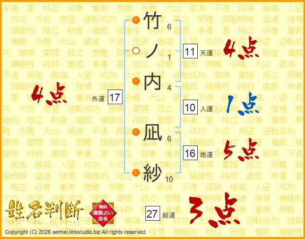 竹(6画)ノ(1画)内(4画) 凪(6画)紗(10画)