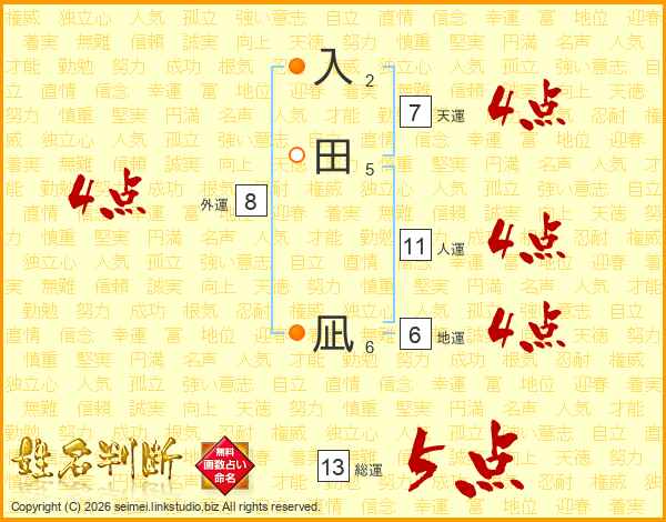 生活面を象徴する運勢です。外部から受ける影響力を表し、結婚運、家庭運や職場、環境への順応性を表します。総運から人運を引いた画数。姓や名が1文字の場合を除く。